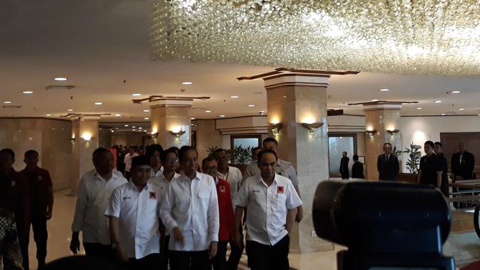 Dia disambut teriakan para relawan ketika tiba di lokasi. "Pak Jokowi... Pak Jokowi...," teriak para relawan di aula Hotel Grand Sahid, Jakarta Pusat, Minggu (16/9/2018).