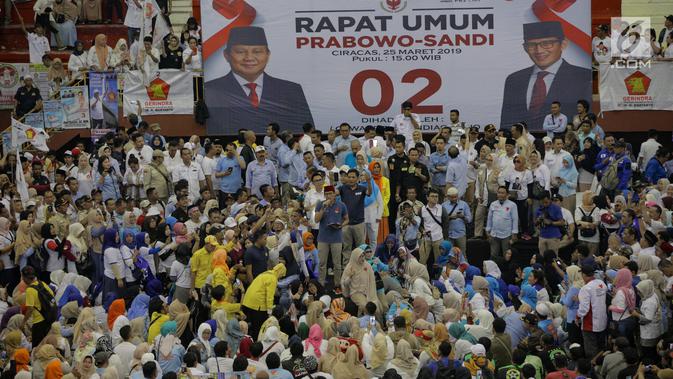 Liputan6.com, Jakarta - Calon Wakil Presiden nomor urut 02 Sandiaga Uno menghhadiri acara Rapat Umum Prabowo-Sandi di GOR Ciracas, Susukan, Jakarta Timur. Kehadiran Sandiaga membuat suasana menjadi meriah