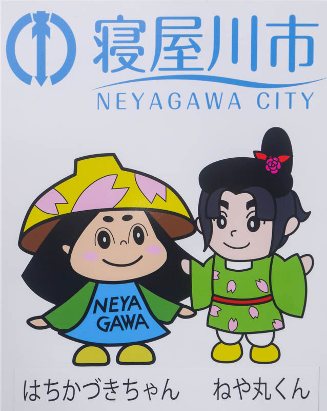 白無地の機材には寝屋川市のマスコットキャラクター「はちきかづきちゃん」と「ねや丸くん」の姿が。
