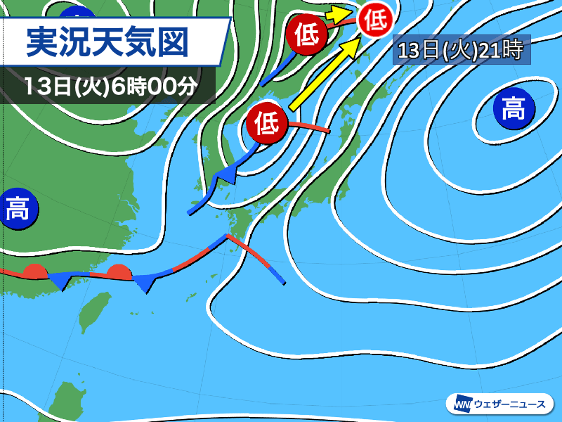 特に日本海北部や中国大陸にある低気圧は今朝6時の段階で1000hPaや1002hPaで、21時には986hPaまで発達して北海道の北に進む見込みです。